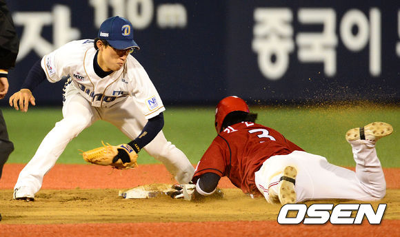 24일 오후 창원 마산야구장에서 열린 2013 한국야쿠르트 세븐프로야구 NC 다이노스와 KIA 타이거즈의 경기, 5회초 무사 1루에서 KIA 신종길 타석 때 1루주자 김선빈이 도루에 성공하고 있다.