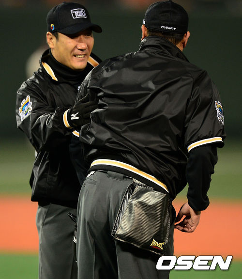 24일 오후 서울 목동야구장에서 열린 '2013 한국야쿠르트 세븐 프로야구' 넥센 히어로즈와 두산 베어스의 경기, 6회 공수교대에 문동균 2루심이 임채섭 구심의 등을 긁어주고 있다.