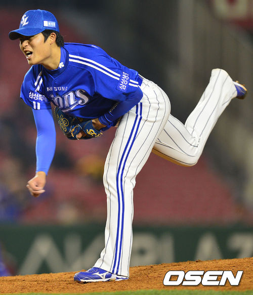 24일 오후 서울 잠실야구장에서 '2013 한국야쿠르트 세븐 프로야구' LG 트윈스 대 삼성 라이온즈의 경기가 열렸다. 7회말 LG 공격 1사 1, 2루 상황에서 구원등판한 삼성 투구 심창민이 힘차게 공을 던지고 있다.