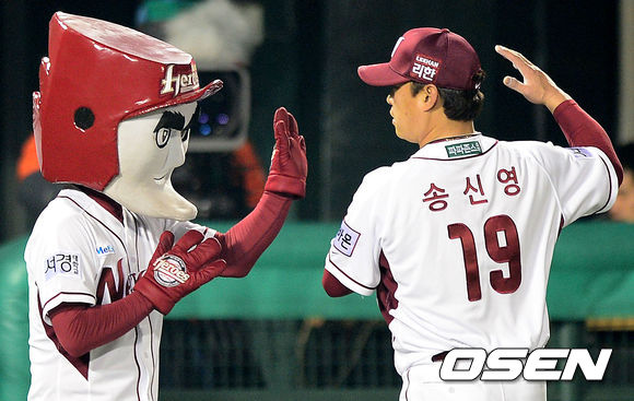 24일 오후 서울 목동야구장에서 열린 '2013 한국야쿠르트 세븐 프로야구' 넥센 히어로즈와 두산 베어스의 경기, 8회초 마운드에 오른 넥센 송신영이 무실점으로 수비를 마치고 더그아웃으로 향하며 턱돌이와 장난을 치고 있다.