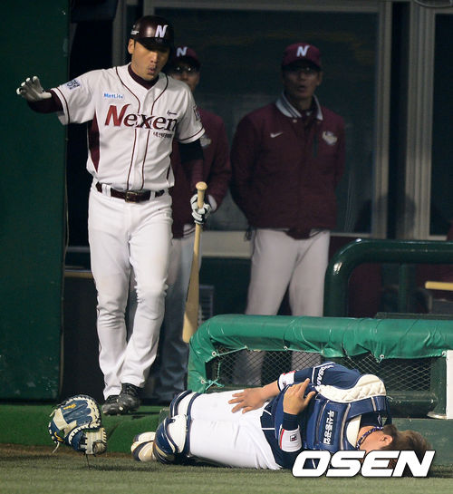 24일 오후 서울 목동야구장에서 열린 '2013 한국야쿠르트 세븐 프로야구' 넥센 히어로즈와 두산 베어스의 경기, 8회말 무사에서 두산 최재훈이 넥센 서건창의 파울 타구를 잡기 위해 몸을 날리며 더그아웃 펜스에 부딪히고 괴로워하고 있다.