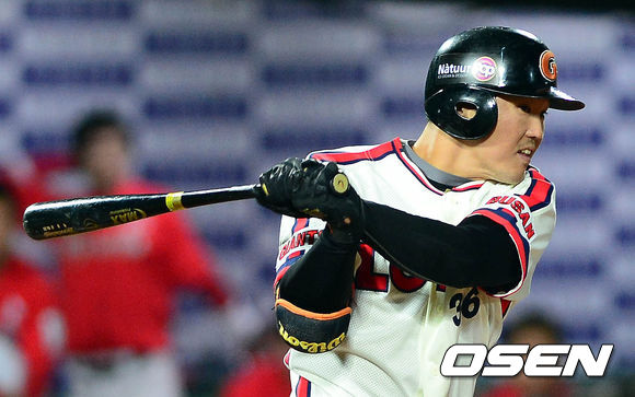 24일 오후 부산 사직구장에서 열린 '2013 한국야쿠르트 세븐 프로야구' 롯데 자이언츠와 SK 와이번스의 경기 8회말 2사 1,2루 대타 박종윤이 2타점 3루타를 치고 있다.