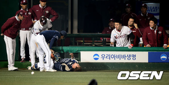 24일 오후 서울 목동야구장에서 열린 '2013 한국야쿠르트 세븐 프로야구' 넥센 히어로즈와 두산 베어스의 경기, 8회말 무사에서 두산 최재훈이 넥센 서건창의 파울 타구를 잡기 위해 몸을 날리며 더그아웃 펜스에 부딪히자 넥센 코칭스태프와 선수들이 놀라고 있다.