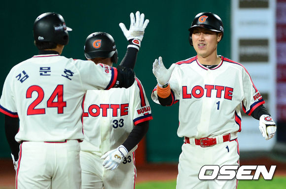 24일 오후 부산 사직구장에서 열린 '2013 한국야쿠르트 세븐 프로야구' 롯데 자이언츠와 SK 와이번스의 경기 8회말 2사 1,2루 대타 박종윤의 2타점 3루타에 홈을 밟은 1루주자 장성호가 덕아웃으로 들어오며 김문호와 하이파이브를 하고 있다.