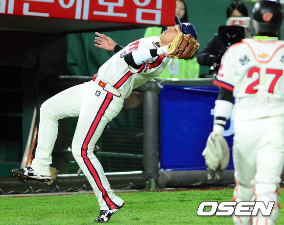 24일 오후 부산 사직구장에서 열린 '2013 한국야쿠르트 세븐 프로야구' 롯데 자이언츠와 SK 와이번스의 경기 9회초 선두타자 조성우의 뜬공을 황재균이 잡고 있다.