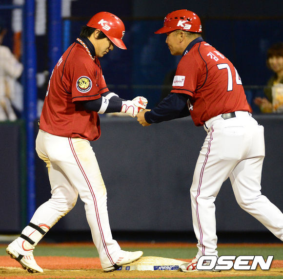 24일 오후 창원 마산야구장에서 열린 2013 한국야쿠르트 세븐프로야구 NC 다이노스와 KIA 타이거즈의 경기, 8회초 2사 1,2루에서 KIA 김선빈이 중전 적시타를 치고 김평호 코치와 하이파이브를 하고 있다.