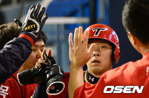 24일 오후 창원 마산야구장에서 열린 2013 한국야쿠르트 세븐프로야구 NC 다이노스와 KIA 타이거즈의 경기, 8회초 2사 1,2루에서 KIA 김선빈의 중전 적시타 때 홈을 밟은 2루주자 안치홍이 덕아웃에서 동료들의 축하를 받고 있다.