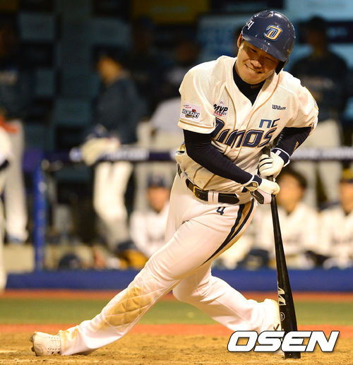 24일 오후 창원 마산야구장에서 열린 2013 한국야쿠르트 세븐프로야구 NC 다이노스와 KIA 타이거즈의 경기, 8회말 2사 1,2루에서 삼진을 당한 NC 지석훈이 아쉬워하고 있다.