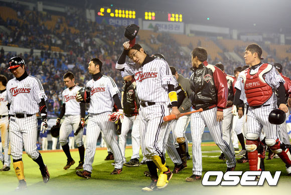 24일 오후 서울 잠실야구장에서 '2013 한국야쿠르트 세븐 프로야구' LG 트윈스 대 삼성 라이온즈의 경기가 열렸다. 원정팀 삼성이 홈팀 LG를 3-2로 꺾고 승리를 거뒀다. 패배한 LG 선수들이 팬들에게 인사한 뒤 그라운드를 나서고 있다.