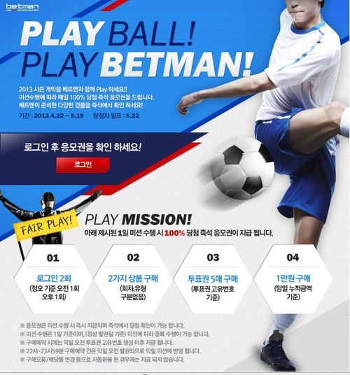 2013시즌을 맞이한 프로야구, 프로축구 등을 기념해 준비된 이번 이벤트는 베트맨에서 제시하는 네 가지 미션을 수행할 경우 100% 당첨이 가능한 즉석 응모권이 발행되는 형태로 진행된다.