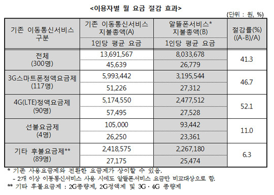 선불요금제에서 알뜰폰서비스로 전환한 경우 11.0%, 기타 후불요금제에서 알뜰폰서비스로 전환한 경우 6.3% 절감에 불과하지만 3G스마트폰 정액요금제 이용자는 알뜰폰으로 전환하면서 46.7%(5만1226원→2만7312원), 4G(LTE)폰 정액요금제 이용자는 52.1%(5만7495원 → 2만7528원)의 통신비를 절감했다.