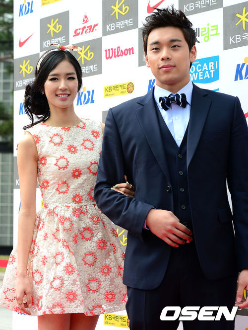 25오후 서울 광진구 건국대 새천년 기념관에서 진행된 '2012-2013 KB국민카드 프로농구 시상식'에서 앞서 진행된 레드카펫 행사에서 LG 박래훈과 치어리더 박기량이포토타임을 갖고 있다.