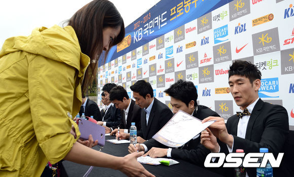 25오후 서울 광진구 건국대 새천년 기념관에서 진행된 '2012-2013 KB국민카드 프로농구 시상식'에서 앞서 열린 사인회에서 모비스 양동근이 여성팬에게 사인종이를 건네고 있다.