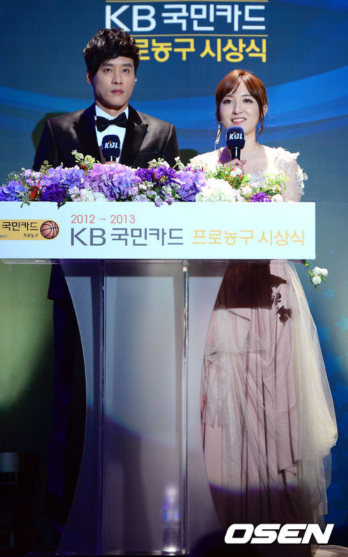 25오후 서울 광진구 건국대 새천년 기념관에서 진행된 '2012-2013 KB국민카드 프로농구 시상식'에서 SBS-ESPN 우지원 해설위원과 장유례 아나운서가 인사말을 전하고 있다.