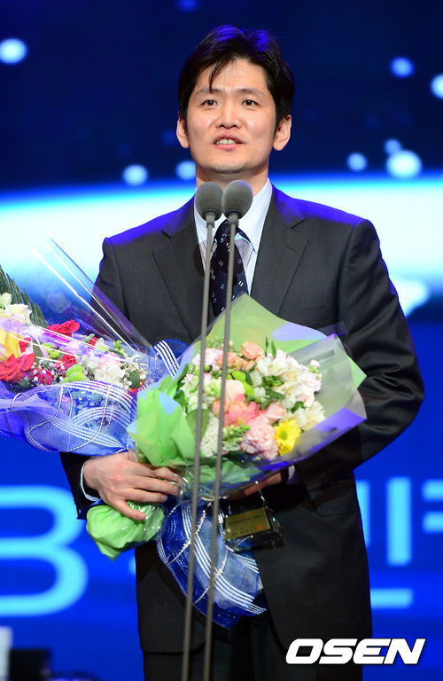 25오후 서울 광진구 건국대 새천년 기념관에서 진행된 '2012-2013 KB국민카드 프로농구 시상식'에서 장준혁 심판이 심판상을 받은 뒤 수상소감을 전하고 있다.