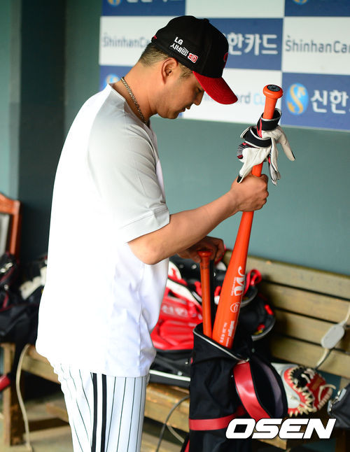 25일 오후 서울 잠실야구장에서 열리는 '2013 한국야쿠르트 세븐 프로야구' LG 트윈스와 삼성 라이온스의 경기에 앞서 LG 최경철이 더그아웃에서 장비를 챙기고 있다. LG는 지난 24일 저녁 넥센으로부터 포수 최경철을 받고 내야수 서동욱을 내주는 조건에 합의하는 1대1 트레이드를 단행했다.