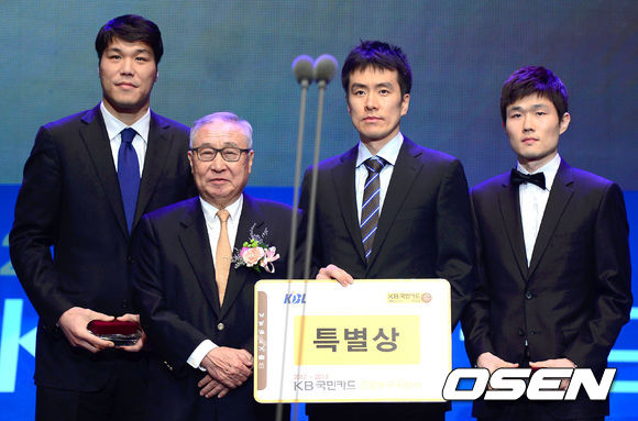 25오후 서울 광진구 건국대 새천년 기념관에서 진행된 '2012-2013 KB국민카드 프로농구 시상식'에서 특별상을 수상한 서장훈, 김성철, 강혁이 김영기 고문과 포토타임을 갖고 있다.