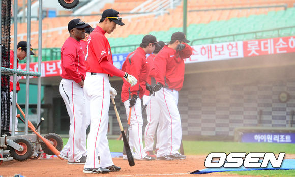 25일 오후 부산 사직구장에서 열리는 '2013 한국야쿠르트 세븐 프로야구' 롯데 자이언츠와 SK 와이번스의 경기 시작 전 SK 선수들이 훈련 중 불어오는 모래바람에 몸을 피하고 있다.