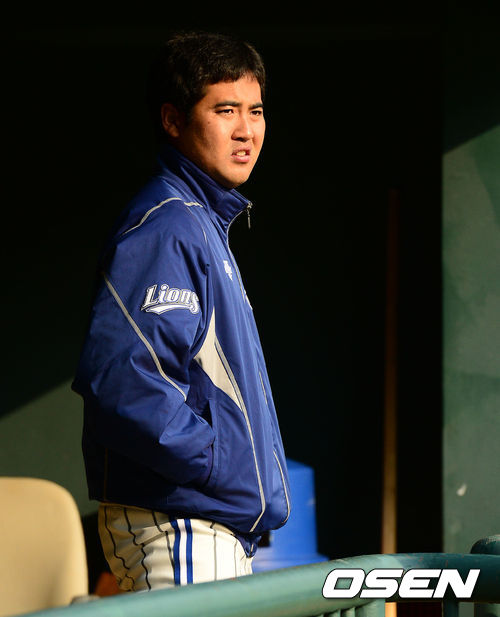 25일 오후 서울 잠실야구장에서 열리는 '2013 한국야쿠르트 세븐 프로야구' LG 트윈스와 삼성 라이온스의 경기에 앞서 삼성 장원삼이 더그아웃에서 그라운드를 바라보고 있다.
