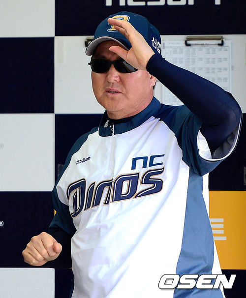 25일 오후 창원 마산야구장에서 열린 2013 한국야쿠르트 세븐프로야구 NC 다이노스와 KIA 타이거즈의 경기, 경기에 앞서 NC 김경문 감독이 덕아웃에서 취재진과 이야기를 나누고 있다.