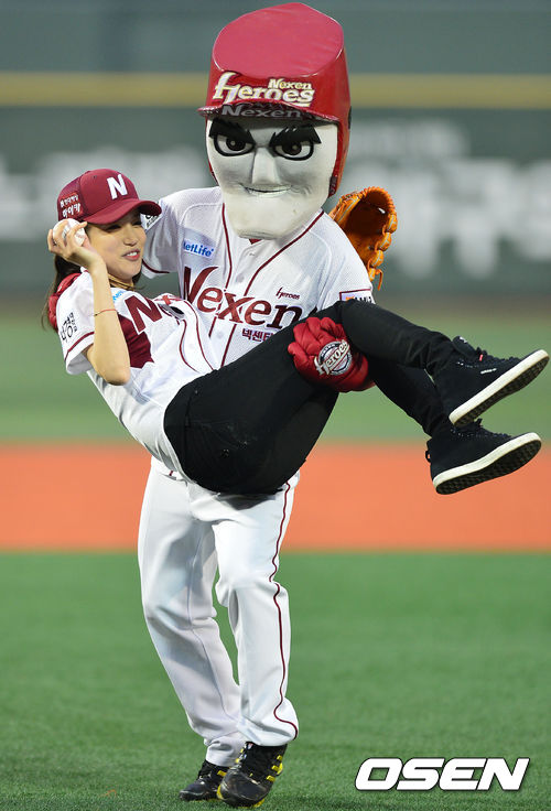 25일 오후 서울 목동구장에서 '2013 한국야쿠르트 세븐 프로야구' 넥센 히어로즈 대 두산 베어스의 경기가 열렸다. 시구자로 나선 배우 오인혜가 턱돌이에게 안겨 마운드로 향하고 있다.