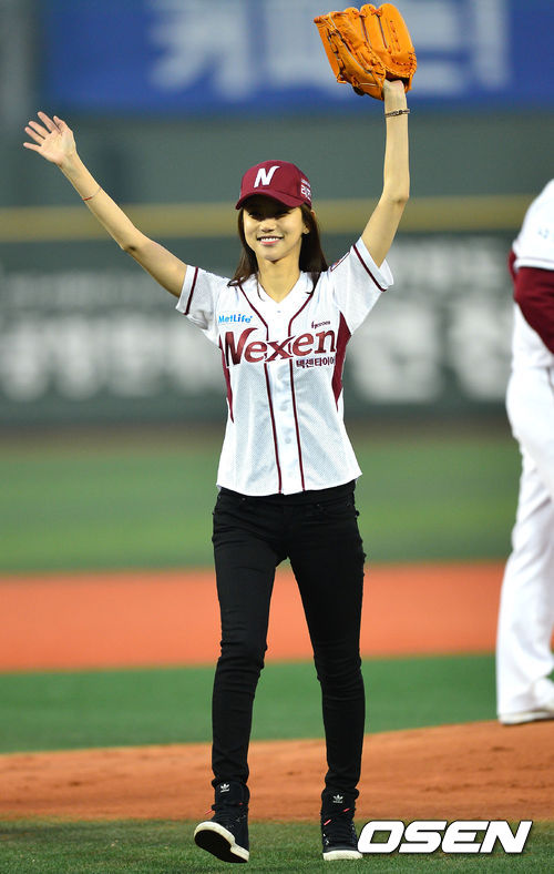 25일 오후 서울 목동구장에서 '2013 한국야쿠르트 세븐 프로야구' 넥센 히어로즈 대 두산 베어스의 경기가 열렸다. 시구자로 나선 배우 오인혜가 공을 던지고 팬들에게 인사하고 있다.