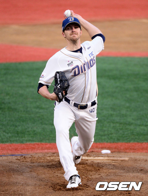 25일 오후 창원 마산야구장에서 열린 2013 한국야쿠르트 세븐프로야구 NC 다이노스와 KIA 타이거즈의 경기, 1회초 무사에서 NC 선발 투수 아담이 힘차게 공을 던지고 있다.