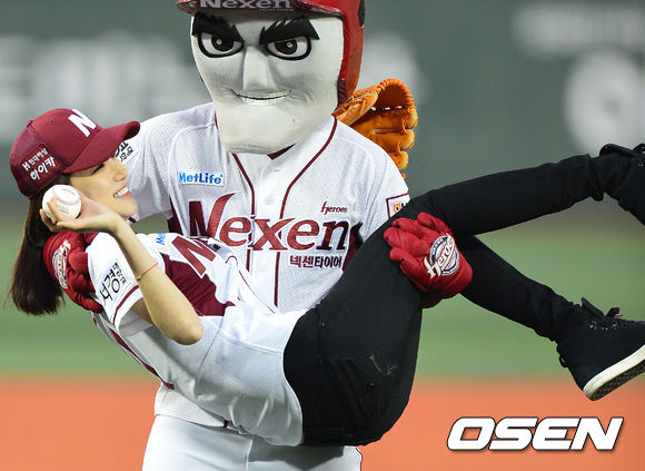 25일 오후 서울 목동구장에서 '2013 한국야쿠르트 세븐 프로야구' 넥센 히어로즈 대 두산 베어스의 경기가 열렸다. 시구자로 나선 배우 오인혜가 턱돌이에게 안겨 마운드로 향하고 있다.