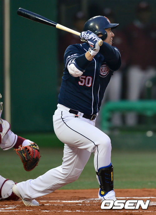 25일 오후 서울 목동구장에서 '2013 한국야쿠르트 세븐 프로야구' 넥센 히어로즈 대 두산 베어스의 경기가 열렸다. 1회초 두산 공격 1사 3루 상황 3번 김현수가 선제 1타점 좌익수 희생플라이를 날리고 있다.