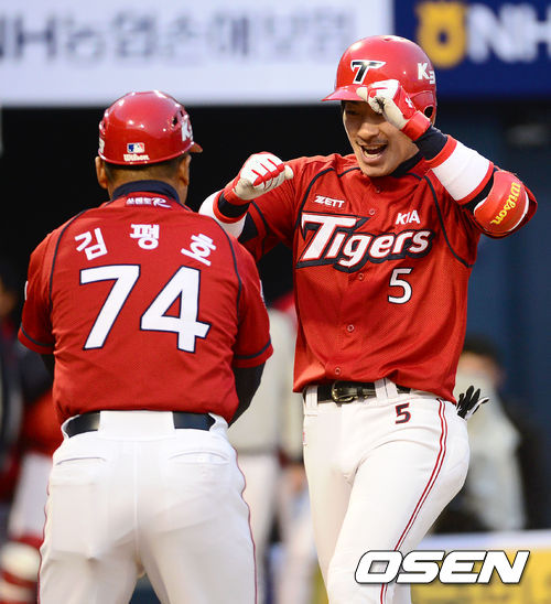 25일 오후 창원 마산야구장에서 열린 2013 한국야쿠르트 세븐프로야구 NC 다이노스와 KIA 타이거즈의 경기, 2회초 2사 1,2루에서 KIA 홍재호가 좌월 스리런 홈런을 치고 홈에서 김평호 코치와 하이파이브를 하고 있다.