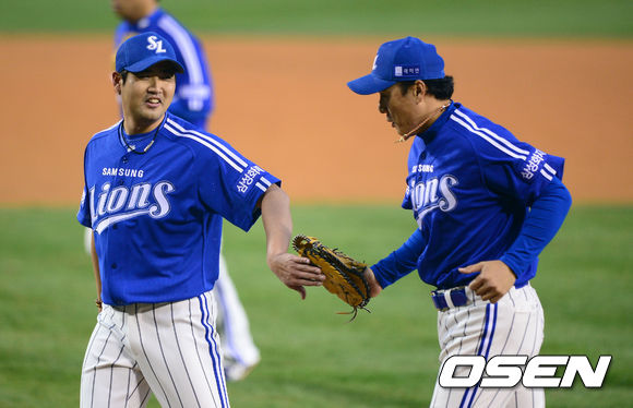 25일 오후 서울 잠실야구장에서 열린 '2013 한국야쿠르트 세븐 프로야구' LG 트윈스와 삼성 라이온스의 경기, 1회말 1사 1루에서 삼성 이승엽이 LG 정의윤의 타구를 1루 라인드라이브로 잡아내고 더블아웃으로 처리하며 장원삼과 하이파이브를 하고 있다.