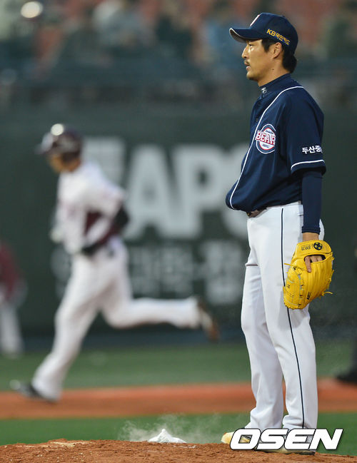 25일 오후 서울 목동구장에서 '2013 한국야쿠르트 세븐 프로야구' 넥센 히어로즈 대 두산 베어스의 경기가 열렸다. 1회말 넥센 공격 2사 주자 없는 상황 3번 이택근이 동점 좌월 솔로포를 허용한 두산 선발 김상현이 아쉬워하고 있다.