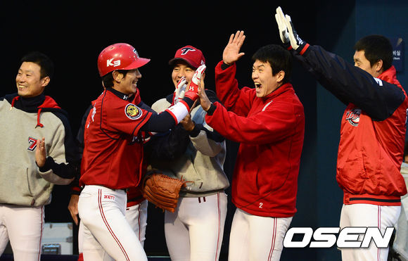 25일 오후 창원 마산야구장에서 열린 2013 한국야쿠르트 세븐프로야구 NC 다이노스와 KIA 타이거즈의 경기, 2회초 2사 1,2루에서 KIA 홍재호가 좌월 스리런 홈런을 치고 덕아웃에서 동료들의 축하를 받고 있다.