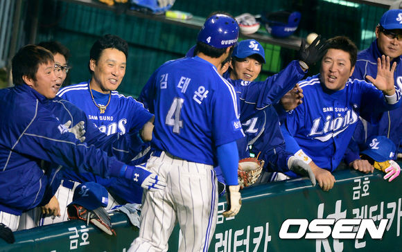25일 오후 서울 잠실야구장에서 열린 '2013 한국야쿠르트 세븐 프로야구' LG 트윈스와 삼성 라이온스의 경기, 2회초 2사 1,3루에서 삼성 김태완이 모상기의 2루 도루에 LG 손주인이 볼을 빠뜨리는 틈을 타 홈을 밟고 동료선수들과 하이파이브를 하고 있다.