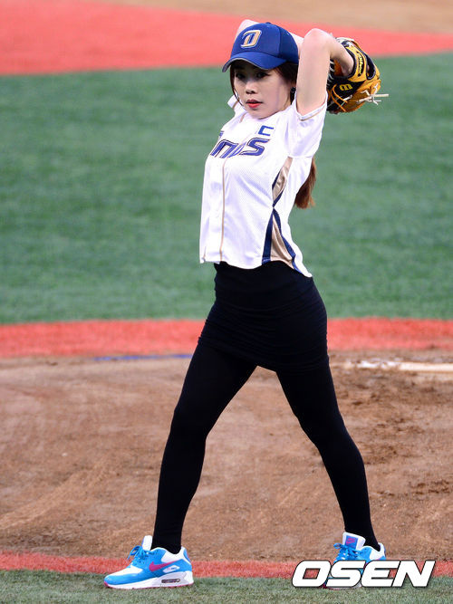 25일 오후 창원 마산야구장에서 열린 2013 한국야쿠르트 세븐프로야구 NC 다이노스와 KIA 타이거즈의 경기, 경기에 앞서 법의 날을 맞아 창원지법 여판사가 시구를 하고 있다.