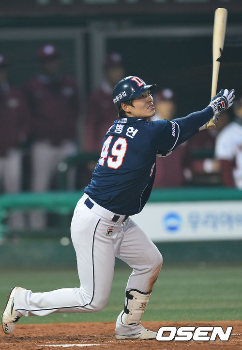 25일 오후 서울 목동구장에서 '2013 한국야쿠르트 세븐 프로야구' 넥센 히어로즈 대 두산 베어스의 경기가 열렸다. 3회초 두산 공격 1사 1루 상황 2번 민병헌이 우중간 2루타를 날리고 있다.
