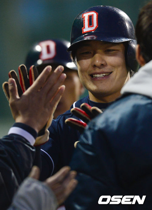 25일 오후 서울 목동구장에서 '2013 한국야쿠르트 세븐 프로야구' 넥센 히어로즈 대 두산 베어스의 경기가 열렸다. 3회초 두산 공격 1사 2, 3루 상황 3번 김현수의 1루수 앞 땅볼 때 넥센 1루수 박병호의 홈 송구 실책으로 득점에 성공한 민병헌이 더그아웃 동료들과 인사를 나누고 있다.