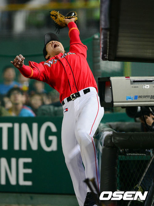 25일 오후 부산 사직구장에서 열린 '2013 한국야쿠르트 세븐 프로야구' 롯데 자이언츠와 SK 와이번스의 경기 3회말 1사 1루 전준우의 파울 타구를 한동민이 쫓아가 봤지만, 놓치고 있다.