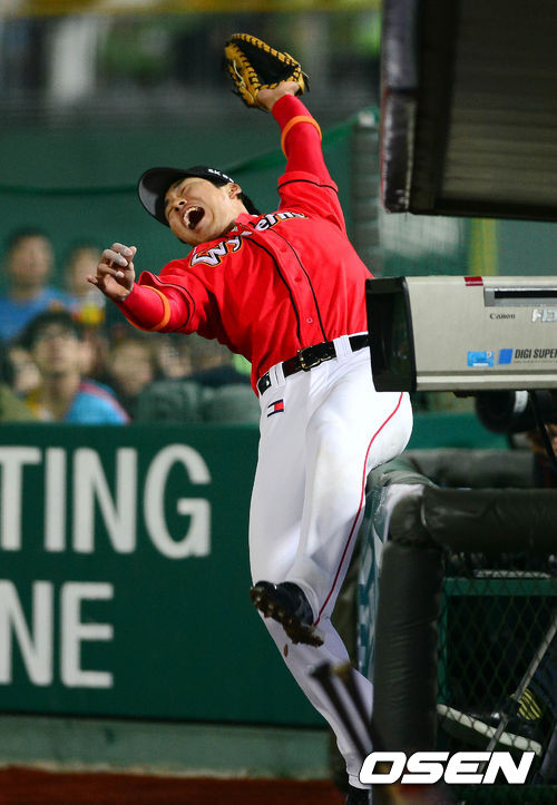 25일 오후 부산 사직구장에서 열린 '2013 한국야쿠르트 세븐 프로야구' 롯데 자이언츠와 SK 와이번스의 경기 3회말 1사 1루 전준우의 파울 타구를 한동민이 쫓아가 봤지만, 놓치고 있다.