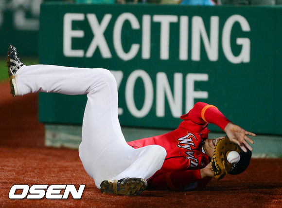 25일 오후 부산 사직구장에서 열린 '2013 한국야쿠르트 세븐 프로야구' 롯데 자이언츠와 SK 와이번스의 경기 3회말 1사 1루 전준우의 파울 타구를 한동민이 쫓아가 봤지만, 놓치고 있다.