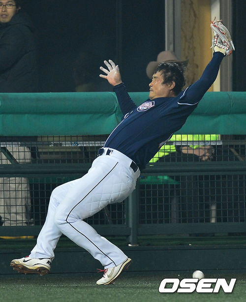 25일 오후 서울 목동구장에서 '2013 한국야쿠르트 세븐 프로야구' 넥센 히어로즈 대 두산 베어스의 경기가 열렸다. 3회말 넥센 공격 2사 2, 3루 상황 3번 이택근의 3루 파울 플라이 때 두산 3루수 김동주가 타구를 놓치며 중심을 잃고 넘어지고 있다.