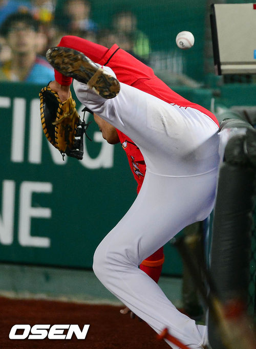 25일 오후 부산 사직구장에서 열린 '2013 한국야쿠르트 세븐 프로야구' 롯데 자이언츠와 SK 와이번스의 경기 3회말 1사 1루 전준우의 파울 타구를 한동민이 쫓아가 봤지만, 놓치고 있다.
