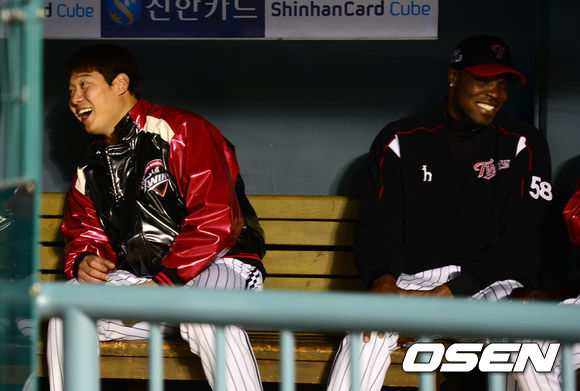 25일 오후 서울 잠실야구장에서 열린 '2013 한국야쿠르트 세븐 프로야구' LG 트윈스와 삼성 라이온스의 경기, LG 류제국이 리즈와 더그아웃에서 이야기를 나누며 즐거워하고 있다.
