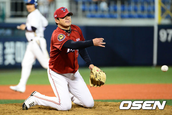 25일 오후 창원 마산야구장에서 열린 2013 한국야쿠르트 세븐프로야구 NC 다이노스와 KIA 타이거즈의 경기, 4회초 2사 1,2에서 NC 지석훈의 타구를 처리하다 넘어진 KIA 서재응이 앉은 채 1루로 송구하고 있다.