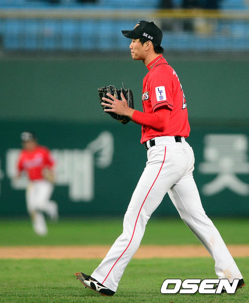 25일 오후 부산 사직구장에서 열린 '2013 한국야쿠르트 세븐 프로야구' 롯데 자이언츠와 SK 와이번스의 경기 4회말 1사 1,2루 박기혁을 병살로 처리한 김광현이 덕아웃으로 향하며 글러브를 치고 있다.