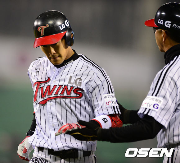 25일 오후 서울 잠실야구장에서 열린 '2013 한국야쿠르트 세븐 프로야구' LG 트윈스와 삼성 라이온스의 경기, 5회말 1사 3루에서 LG 정주현이 희생플라이로 동점을 만들고 김인호 코치와 하이파이브를 하고 있다.