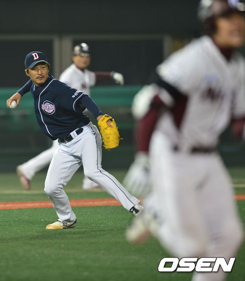 25일 오후 서울 목동구장에서 '2013 한국야쿠르트 세븐 프로야구' 넥센 히어로즈 대 두산 베어스의 경기가 열렸다. 4회말 넥센 공격 무사 1, 2루 상황 6번 이성열의 기습 번트 타구를 두산 선발 김상현이 잡아 1루로 송구하고 있다. 결과는 세이프.