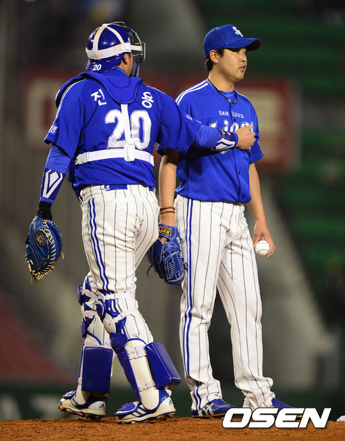25일 오후 서울 잠실야구장에서 열린 '2013 한국야쿠르트 세븐 프로야구' LG 트윈스와 삼성 라이온스의 경기, 6회말 1사 2루에서 삼성 진갑용이 마운드에 올라 장원삼과 이야기를 나누고 있다.