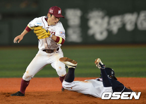 25일 오후 서울 목동구장에서 '2013 한국야쿠르트 세븐 프로야구' 넥센 히어로즈 대 두산 베어스의 경기가 열렸다. 5회초 두산 공격 무사 1루 상황 주자 이종욱이 2루 도루에 성공하고 있다. 태그를 시도하는 넥센 2루수는 서건창.