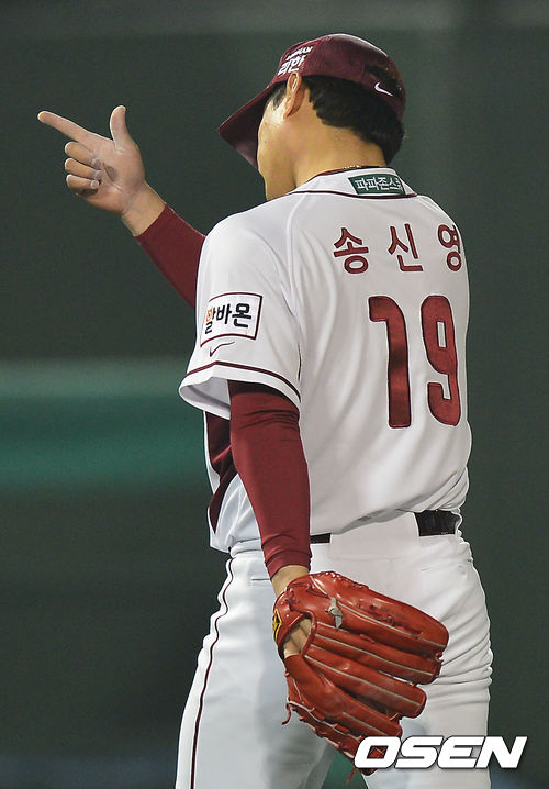 25일 오후 서울 목동구장에서 '2013 한국야쿠르트 세븐 프로야구' 넥센 히어로즈 대 두산 베어스의 경기가 열렸다. 5회초 두산 공격 2사 1, 2루 상황 6번 오재원을 유격수 땅볼로 이끌며 이닝을 무실점으로 마무리지은 넥센 송신영이 포수 박동원과 인사를 나누고 있다.